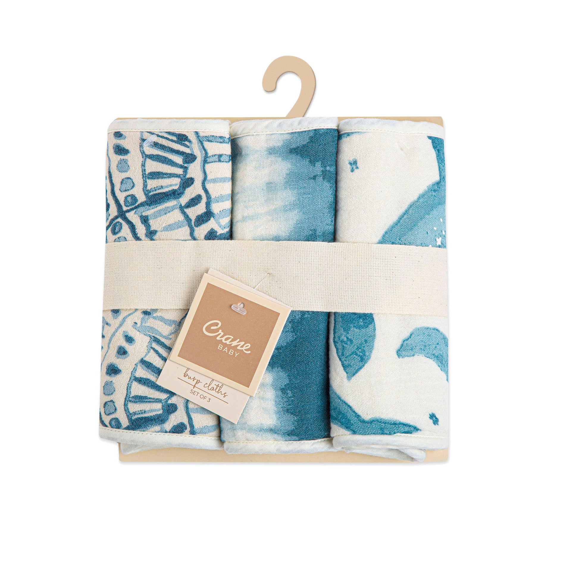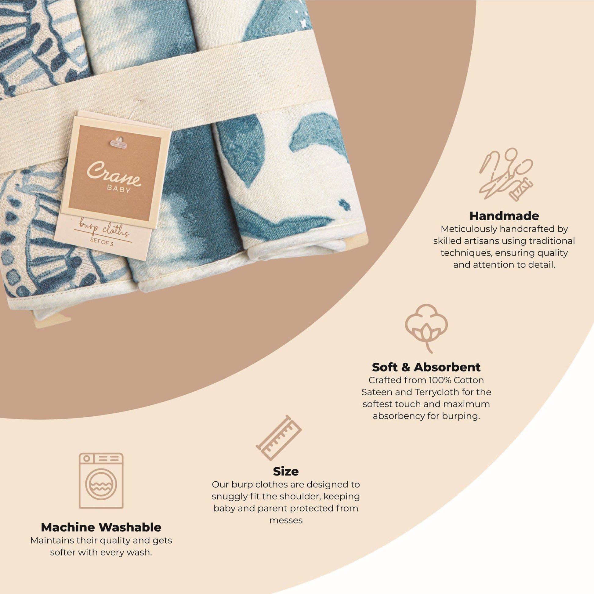 Lightweight and absorbent 100% cotton burp cloths featuring a cotton terry cloth back and cotton muslin front, printed to portray the essence of a watercolor we painted in house. Set includes 3 unique burp cloth designs. Coordinates perfectly with our Crane Baby bibs and muslin swaddle wraps - perfect for gift bundles!